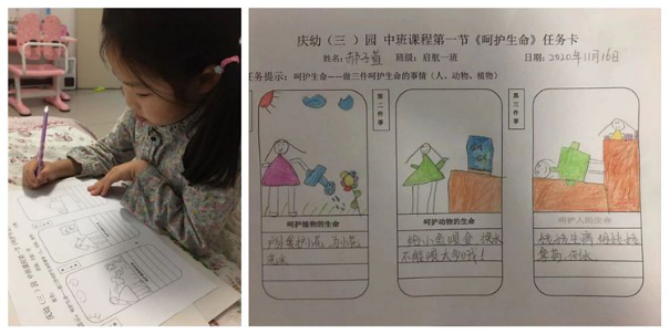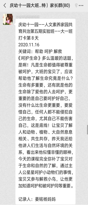 爱护生命、爱护自然,本课的故事从大自然中人与动植物的角度,描绘了人类、树木、啄木鸟、小蚯蚓等动植物相互帮助共建美好家园的场景,为幼儿树立重视任何物种、任何生命,并且了解物种起到积极作用,懂得生命的价值、意义,为幼儿建立健康的生命观与自然观,同时,通过互帮互助的故事体现各个角色的责任担当。另一方面,培育幼儿超越自我的爱,爱自己、爱父母、爱他人、爱自然、爱人类的博爱心理,从而使幼儿的德根在博爱的滋养下茁壮生长。在人文素养家园共育方面,需要教师与家长共同把“视承担责任为爱之表现”作为幼儿的生存理念,在生活中不浪费时间、不浪费生命,懂得爱护生命就要对生命负责的道理。