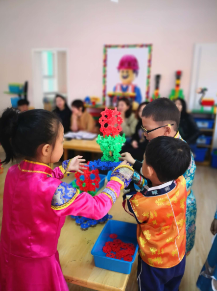 每个小朋友都负责搭建了一部分作品,每个人的作品连在一起就有了每个小组共同的作品,合作游戏可真有趣。