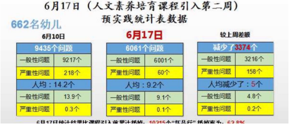 6月3日课程引入前,包钢二园三个实验班105名幼儿共有2332个问题,第一周课程结束后,孩子们累计扔掉1216个“坏品行”,扔掉率为52.1%,经过第二周课程培育,孩子们累计扔1517个“坏品行”,扔掉率为65%。中班人文素养待培育问题累计909个,第一周课程结束后,中班幼儿共扔掉470个“坏品行”,扔掉率51.7%,第二周中班课程结束后,累计扔掉562个“坏品行”,扔掉率为61.8%。