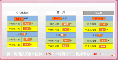 孟园长通过鲜明的数据,让家长深刻感受到,孩子通过上人文素养培育课程,留下好习惯、好品质,累计扔掉439个“坏品行”,第一周扔掉率为48.9%。让我们充分感受到了人文素养课程的魅力。