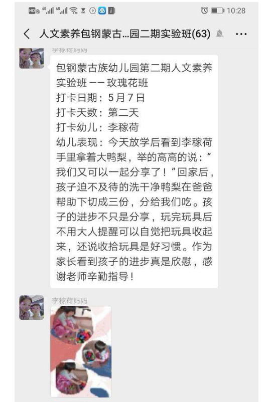在人文素养的滋养下,孩子们天天有变化、日日有惊喜。家长们有感而发:“没有教育不好的孩子,只有坚持不好的家长……”在家长的配合下,园所的重视下,使二期人文素养家园共育共治无缝对接,家园共育共治参与率达到100%,有效的促进了家园共育共治的实施。