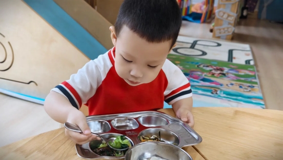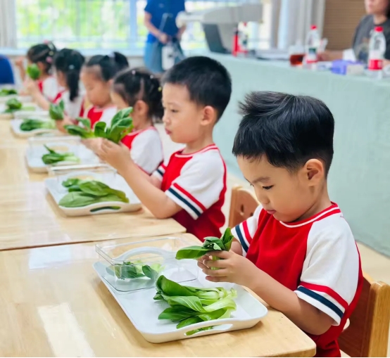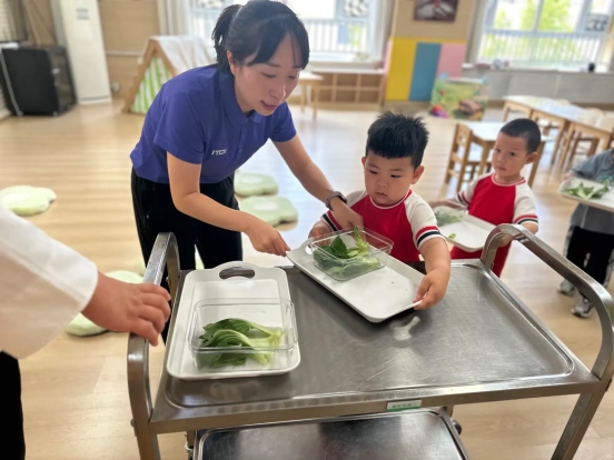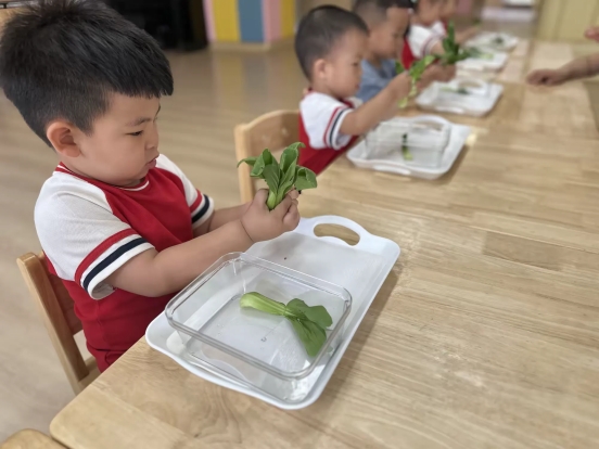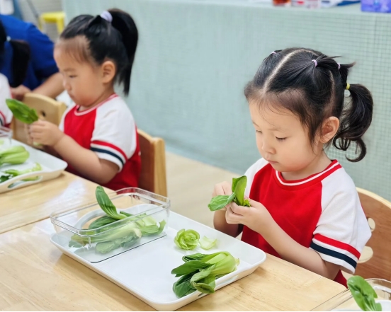 在托班的餐桌上,每一颗蔬菜、每一片菜叶都藏着成长的魔法。当孩子们用小手轻轻触摸蔬菜的纹理,用好奇的眼睛观察蔬菜的外观、颜色与形态,那些看似普通的食材便化作了打开生活认知大门的钥匙。我们以趣味为舟、以体验为桨,让孩子们在剥油菜、认蔬菜的互动中,悄然感知食物的奇妙,也悄然收获动手的喜悦与自信的萌芽。