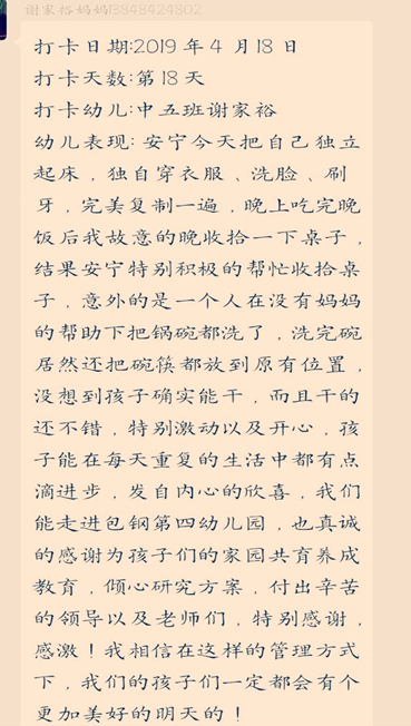 包钢四园人文素养培育引入课程大班组从2019年4月1日开始至4月19日全部结束。孩子们依依不舍,在这14节课中孩子们学会了好习惯留下,坏习惯扔掉。学会了坚持、更学会了认真,学会了……在接下来的第二期课程实施中,老师们将继续不断深入理解核心概念的意义,归纳整理适合本班幼儿实际情况的活动设计,让幼儿更好地建立心理机制,留下好习惯、好品质,真正实现“自立”“自强”“自尊”,为美好的未来奠定坚实的基础。我园将在中国教育发展战略学会人文教育专业委员会专家的引领和指导下,继续深入开展人文素养启迪课程,不断总结积累课程开展的实践经验,为培养具有人文情怀的儿童而不懈努力!